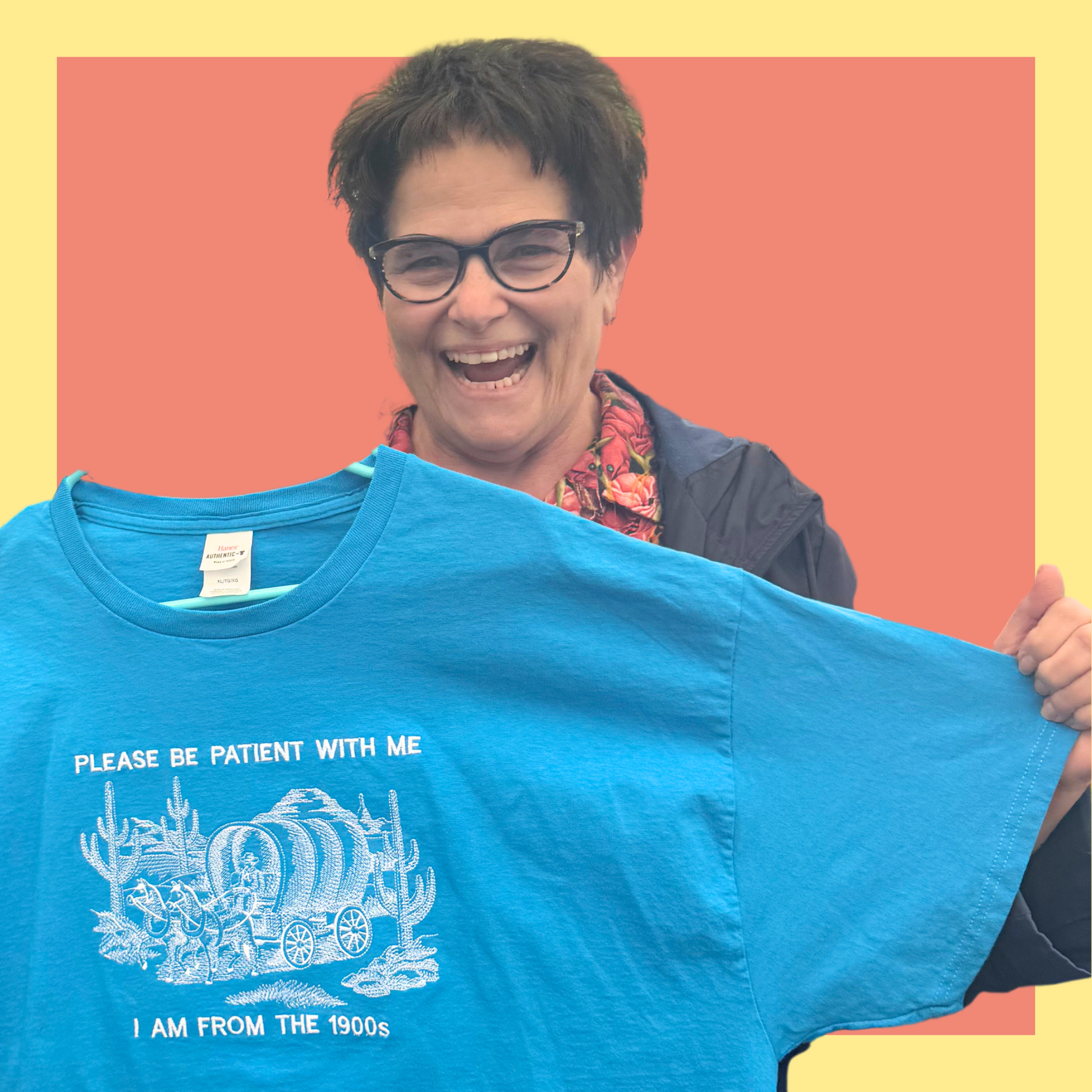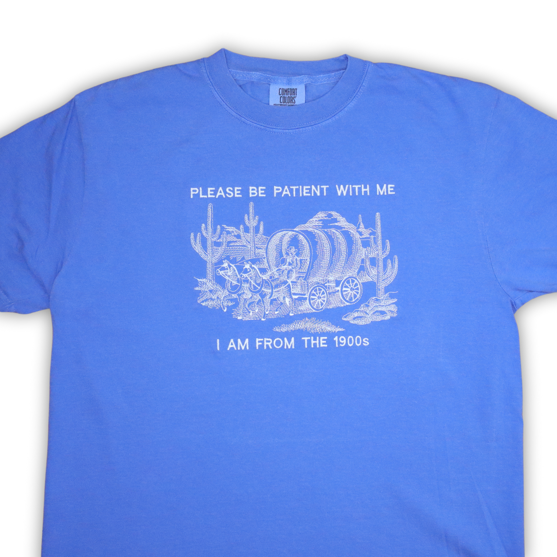 This Comfort Colors embroidered tee brings humor and nostalgia together with a covered wagon design and the playful phrase, “Please be patient with me. I am from the 1900s.” Crafted from soft, garment-dyed cotton, this short-sleeve shirt offers the relaxed, broken-in feel Comfort Colors is known for. Shown in five earthy tones, it’s the perfect everyday tee with a vintage edge.