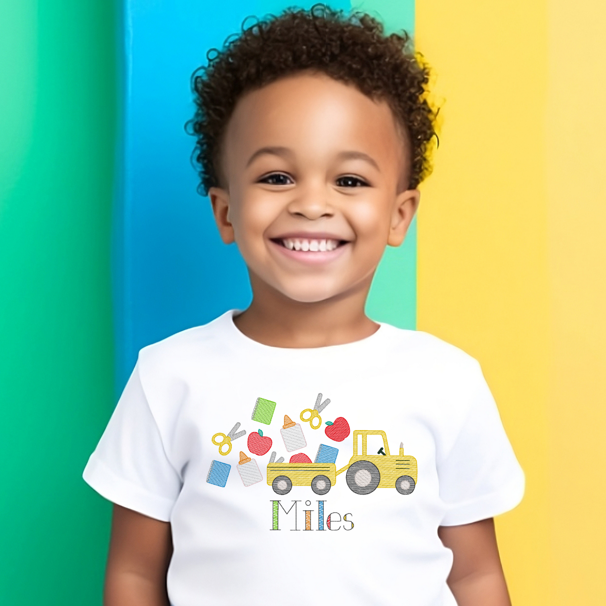 Embroidered in a playful sketch style, this back to school tee features a cheerful blue tractor hauling a load of school supplies—complete with colorful lettering to match. It's a fun and unique design that stands out in first day photos and celebrates the excitement of the new school year.