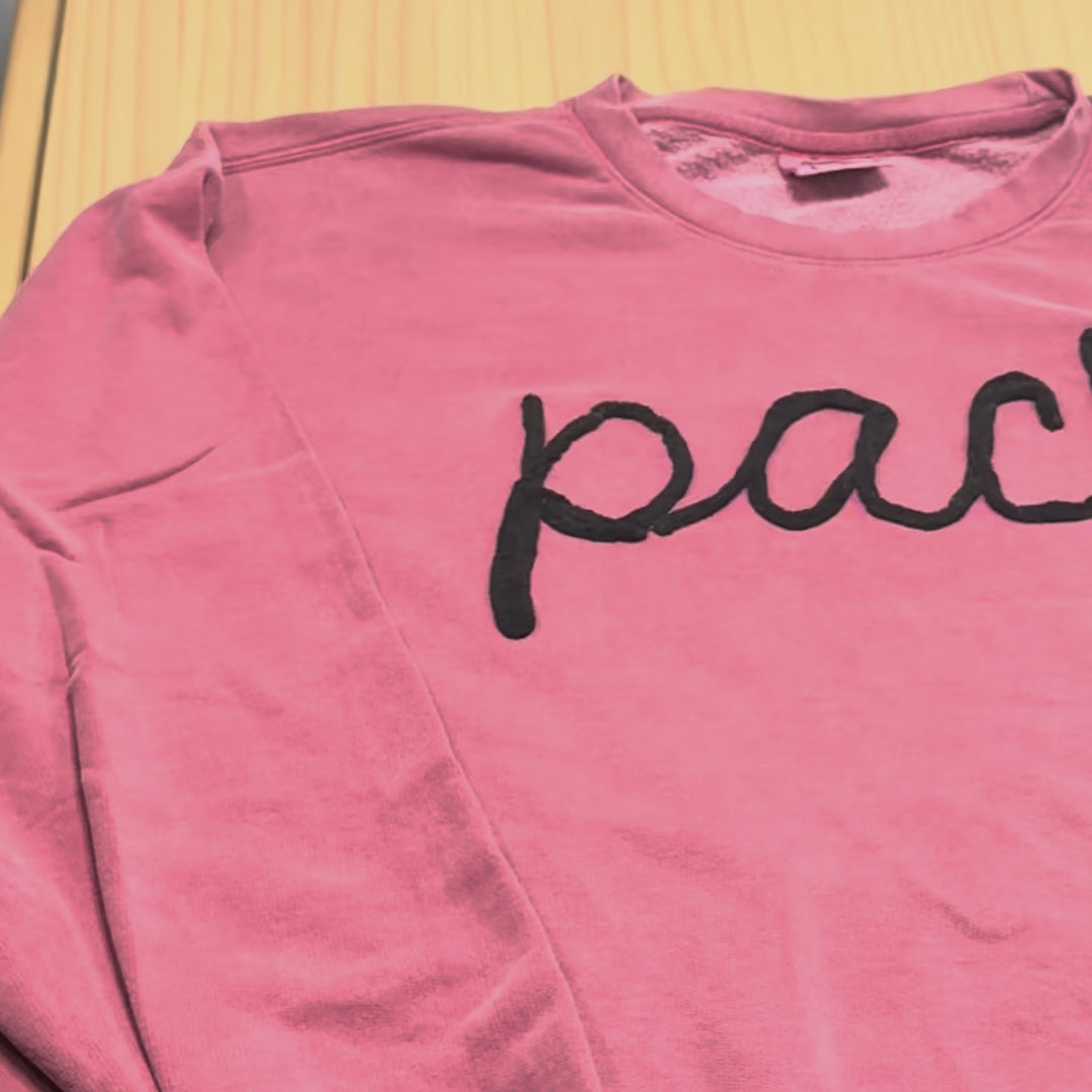 Personalize this lightweight comfort colors sweatshirt to display any letters/name you can dream! The lettering for this sweatshirt is done in a Yarn style, where the letters appear as one continuous, cursive string of yarn stitched onto the sweatshirt.