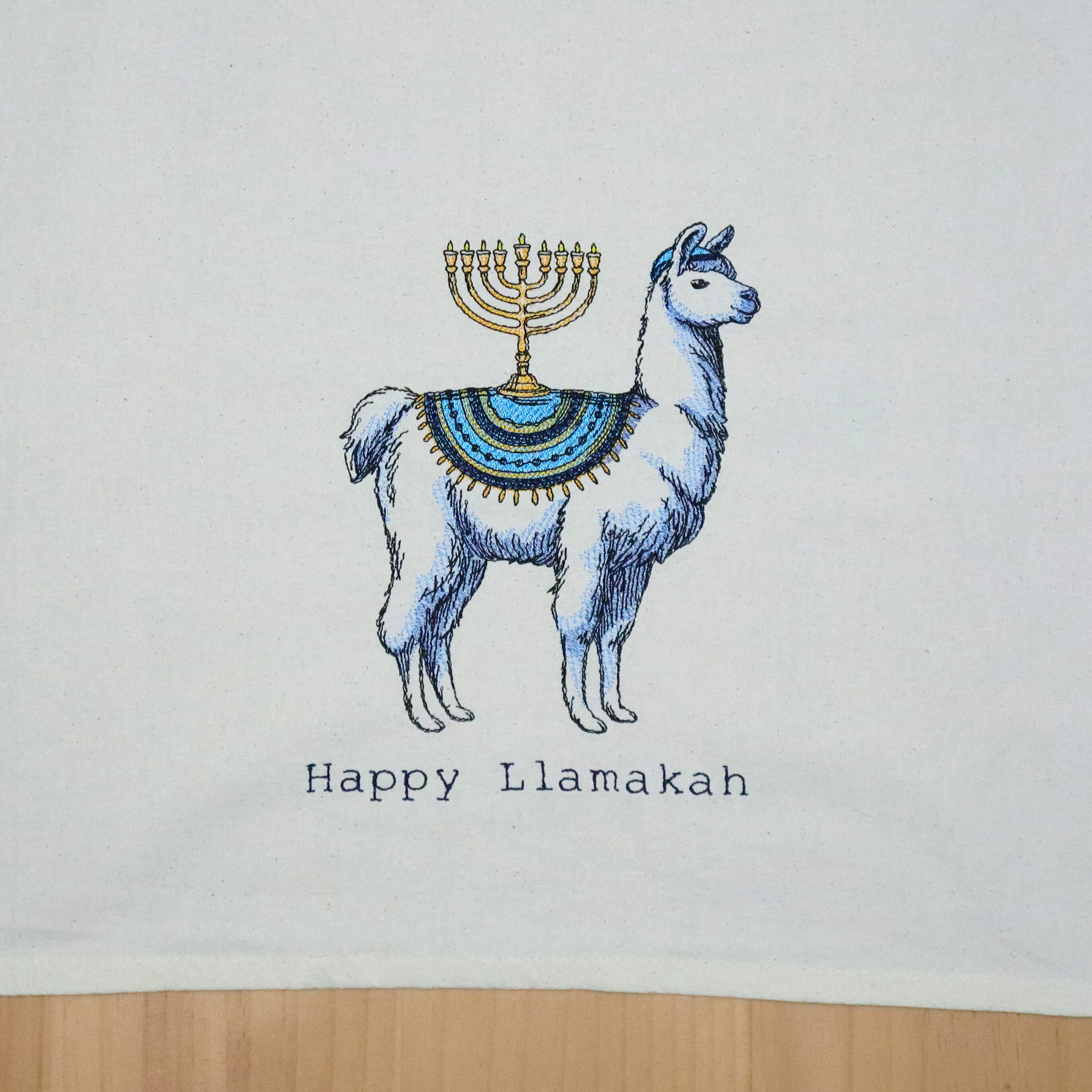 This towel is a crowd favorite every single year. Featuring a llama wearing a yamaka and carrying a menorah on its back, with the phrase "Happy Llamakah," this embroidered kitchen towel is sure to delight. It measures 28"x20" and features the herringbone style of towel. The design is intricate and almost looks like it was painted on. Perfect for any kitchen this holiday season!