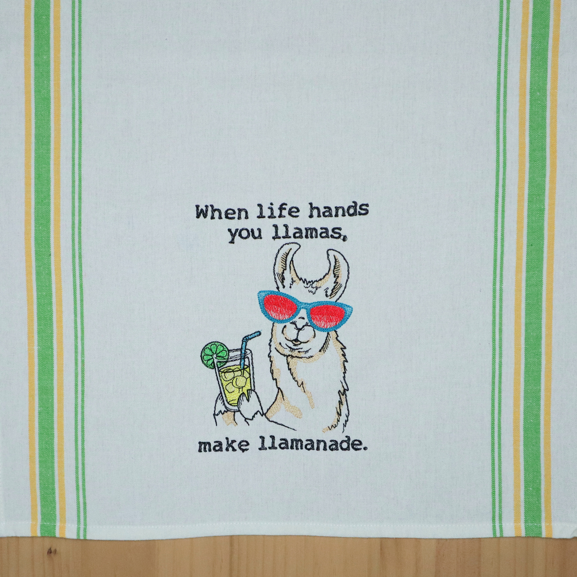 Bring a little humor to your kitchen with this playful embroidered towel. With a cheerful llama holding a glass of lemonade and the phrase *when life hands you llamas, make llamanade,* it puts a fun spin on a classic saying.