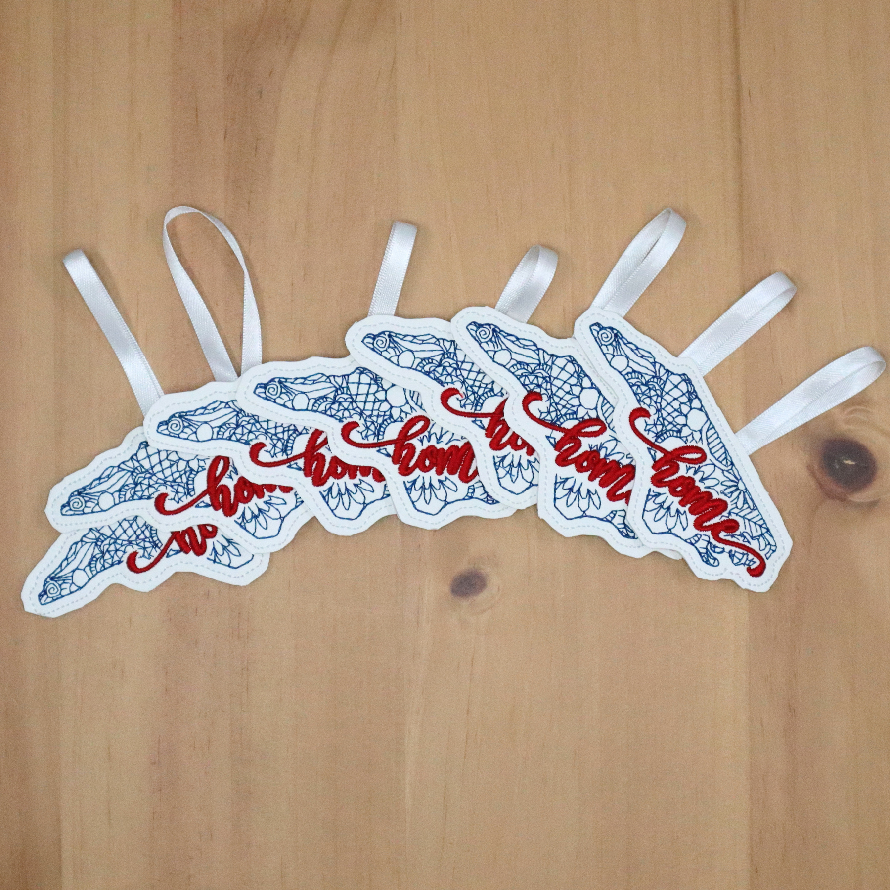 Add a little handmade charm to your tree with this machine-embroidered ornament. Each one is stitched on durable marine vinyl for great structure and long-lasting color, and it’s finished with a coordinating ribbon for easy hanging.