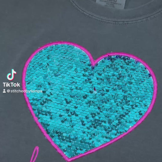 - Heart applique with flippy sequins adds texture, sparkle, and lasting charm