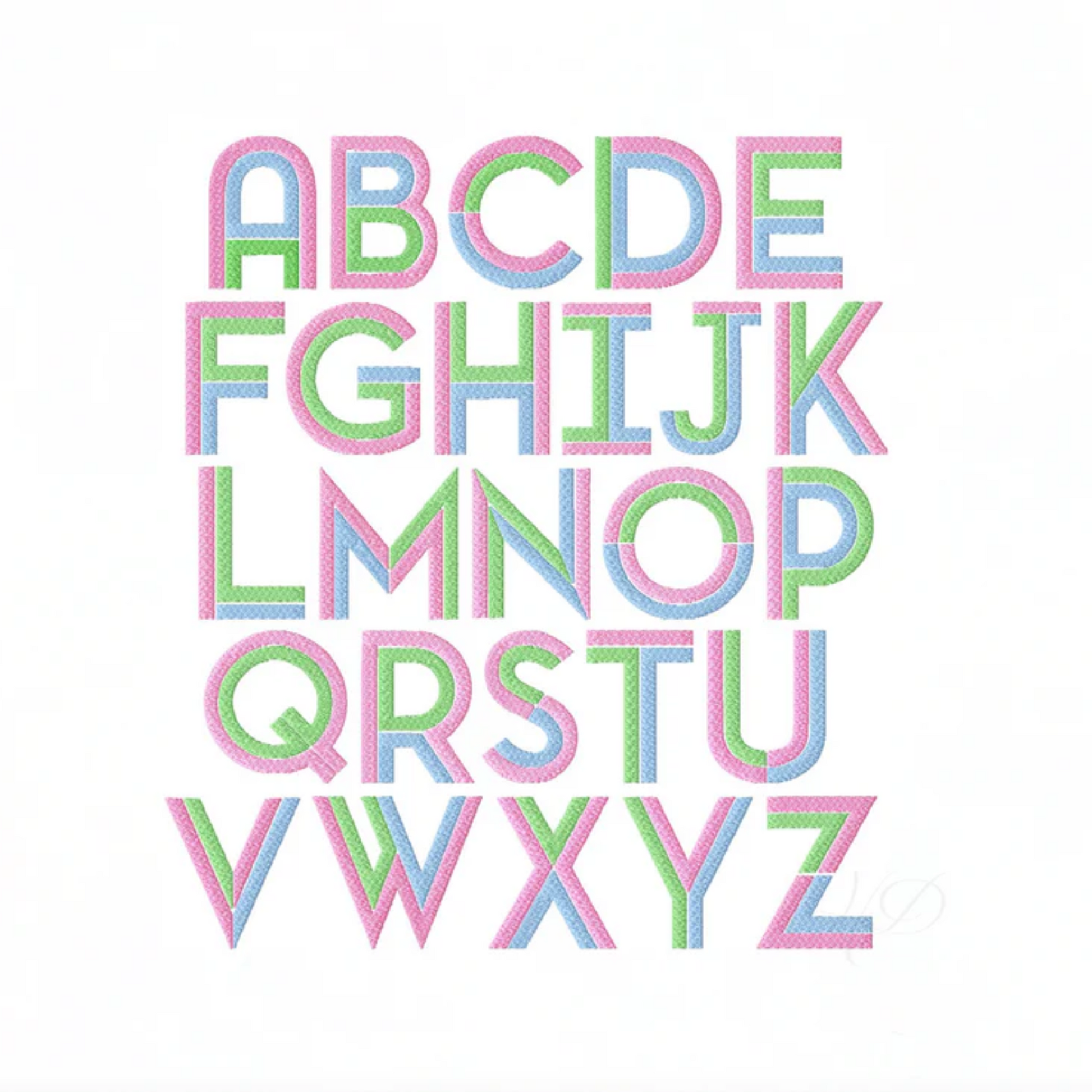 The alphabet shown on the second photo is a stock photo showing the designs for each letter. Tempa will match the thread colors to the ricrac colors on the tote. This tote bag works best with 1, 2, or 3 letters.