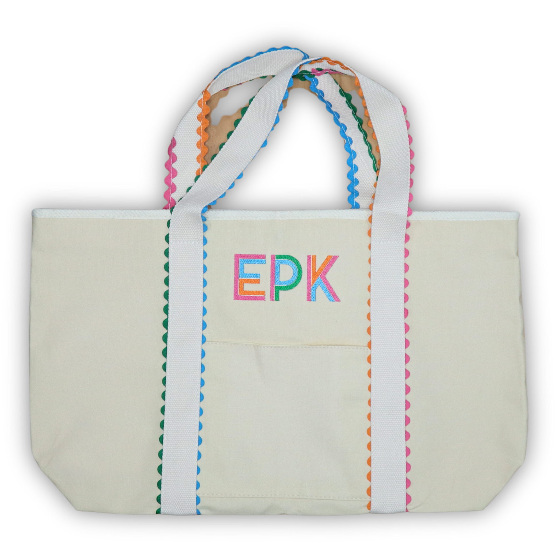 Bright, bold, and one-of-a-kind—this tote is all about playful details. Four rows of colorful ricrac trim make it stand out, giving off a fun, cheerful vibe that works just as well for errands as it does for the beach or a weekend outing. What makes it extra special? Your custom monogram in coordinating thread colors to tie it all together. Roomy, sturdy, and full of personality, it’s the bag that’s as unique as you are.